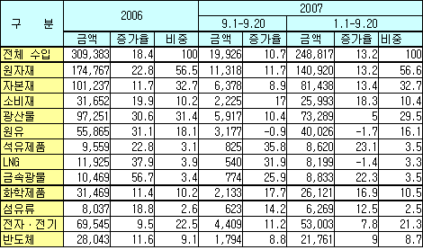 산자부, 9월 1-20일 17.7% 증가해 21억달러 … 원유는 0.8% 감소 화학제품의 2007년 9월 1-20일 수입이 17.7% 증가한 21억3300만달러를 기록한 것으로 나타났다.산업자원부가 발표한 <2007년 9월 수출입동향>에 따르면, 9월 수입은 전년동월대비 2.1% 감소한 270억6000만달러이지만 조업일수를 고려한 하루평균 수입액은 전년동월대비 18.0% 증가한 13억9000만달러로 증가세를 지속하고 있다.