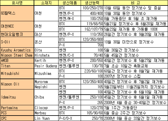 다만, Nippon Oil은 Negishi 소재 벤젠 16만5000톤 플랜트를 9월23일부터 11월25일까지 64일간 정기보수할 예정인 것으로 알려졌다. <이선애 기자> 표, 그래프: | 아시아 BTX 플랜트 가동현황(2007) | <화학저널 2007/10/4> |