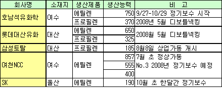 호남ㆍSK 10월 한달간 정기보수 … 삼성토탈은 프로필렌 가동 시작 호남석유화학이 9월27일부터 에틸렌(Ethylene) 크래커의 정기보수에 돌입했다.호남은 10월29일까지 약 한달간 정기보수를 실시할 예정이며 2008년 5월에는 디보틀넥킹을 통해 에틸렌 생산능력을 3만톤 확장할 계획이다. SK에너지도 10월부터 한달간 에틸렌 19만톤 크래커 정기보수를 실시할 예정이어서 10월 에틸렌 가격변화가 주목된다.