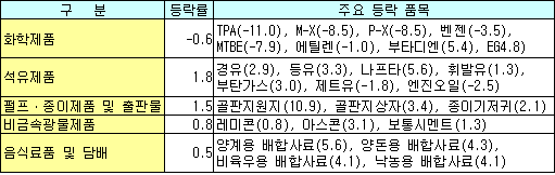 펄프, 종이제품 및 출판물은 고지 및 펄프 등 원재료 가격상승으로 골판지원지, 골판지상자 등이 올라 1.5%, 비금속광물제품은 국제유가 상승과 시멘트 과잉공급 해소 등으로 레미콘, 아스콘, 보통시멘트 등이 올라 0.8% 상승했다. <김 은 기자> 표, 그래프: | 공산품의 생산자물가 변화(2007.9) | <화학저널 2007/10/9> |