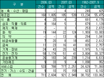 산자부, 제조업 투자 70.2% 급감 … 화학부문은 1억2400만달러 그쳐 2007년 3/4분기 화학산업 등 제조업에 대한 외국인 직접투자가 전년동기대비 70.2% 크게 감소한 것으로 나타났다.산업자원부가 발표한 <2007년 3/4분기 외국인 직접투자 동향>에 따르면, 2007년 3/4분기 외국인직접투자(신고기준)는 29억4900만달러로 2006년 3/4분기 26억400만달러에 비해 13.3% 증가했다. 2006년 2/4분기 이후 5분기만에 증가세로 반전한 것으로 투자건수는 29.5% 증가했고 투자 유치 부진의 주요 요인이었던 1억달러 이상 대규모 투자의 감소폭이 크게 줄어든 반면, 1억달러 미만의 중형투자가 전년동기대비 30% 이상 크게 증가했기 때문으로 분석된다. 원화강세, 고유가 등 외부 여건은 나아지고 있지 않으나, FTA 체결, 외국인투자 촉진시책의 본격 시행 등에 따른 투자자들의 관심 증대 등에 힘입어 지속 감소해 오던 외국인투자가 회복세를 보인 것이다. M&A형 투자는 2006년 2/4분기 이후 감소세를 지속했으나 2007년 3/4분기 82.8% 증가한 1100백만불을 기록하며 증가세로 반전됐고, Greenfield형 투자는 7.6% 감소한 18억4900만달러를 기록했다. 일본의 투자는 전년동기 대규모 투자의 영향 등으로 84.0% 크게 감소한 반면, EUㆍ미국 투자는 60.4% 증가했다.