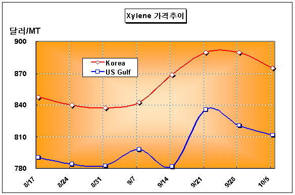 FOB Korea 874-875달러 형성 … P-X도 1028달러로 7달러 하락 자일렌 가격은 10월 첫째 주 FOB Korea 톤당 875달러로 15달러 하락했다.아시아 자일렌(Xylene) 시장은 타이완의 수요기업들이 구매를 줄이면서 2주간의 890달러 강세를 벗어나 9월 중순 수준으로 떨어졌다. 특히, KP케미칼은 타이완에 대한 11월 하순 공급가격으로 CFR Taiwan 톤당 885달러를 요구한 것으로 알려졌다. 미국의 자일렌 가격도 FOB US Gulf 갤런당 266.75-267.25센트로 톤당 평균 812달러를 형성해 9달러 하락했다.