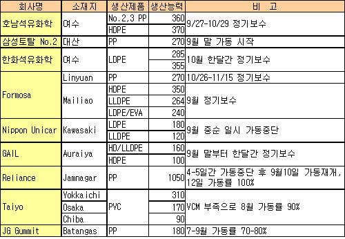 10월 한달간 정기보수 돌입 … 호남도 HDPEㆍPP 정기보수 한화석유화학이 10월 한달간 일정으로 LDPE(Low-Density Polyethylene) 28만5000톤, 35만5000톤 플랜트의 정기보수에 돌입했다.Formosa는 9월부터 Mailiao 소재 HDPE(High-Density Polyethylene)ㆍLDPEㆍLLDPE(Linear Low-Density PE)/EVA(Ethylene Vinyl Acetate) 플랜트의 정기보수를 실시하고 있으며, 호남석유화학도 9월27일부터 10월29일까지 PP(Polypropylene) 36만톤, HDPE 37만톤 플랜트의 정기보수를 실시한다.