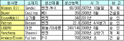 Nippon Oil은 Sendai 소재 플랜트의 생산능력을 9만톤으로 확대하고 ExxonMobil은 싱가폴 플랜트의 생산능력을 34만톤으로 확대하며 Yanchang의 Shaanxi 소재 플랜트는 20만톤으로 확대할 예정이다. Japan Energy는 Kashima 플랜트의 생산능력을 17만톤으로 확대할 계획이다. <이선애 기자> 표, 그래프: | 아시아 BTX 신증설 프로젝트(2007) | <화학저널 2007/10/11> |