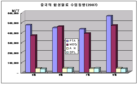 8월 PTAㆍMEG 수입 크게 증가 … AN 소폭 증가에 CPL은 감소 중국의 합섬원료 수입이 호조를 보이고 있다.중국은 2007년 8월 PTA(Purified Terephthalic Acid) 수입량이 56만2315톤으로 7월 43만2886톤에 비해 13만톤 정도 증가했다. MEG(Monoethylene Glycol) 수입도 7월 39만682톤에서 8월 46만9035톤으로 8만톤 가량 증가했다.