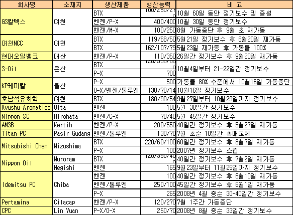 GS칼텍스는 여천 소재 벤젠 10만톤, 톨루엔 25만톤, 자일렌 27만톤 플랜트의 정기보수를 10월부터 60일 동안 실시하며, S-Oil은 온산 소재 벤젠 12만톤, 톨루엔 35만톤, 자일렌 80만톤 플랜트를 10월4일부터 21-22일간 정기보수할 예정이다. <이선애 기자> 표, 그래프: | 아시아 BTX 플랜트 가동현황(2007) | <화학저널 2007/10/12> |