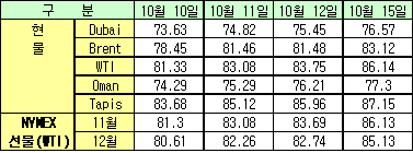 10월15일 WTIㆍBrent 2달러 이상 폭등 … Dubai유도 76.57달러 10월15일 국제유가는 중동지역 긴장 고조 및 동절기 석유 수급 우려 등의 소식에 따라 상승했다.한국석유공사에 따르면, 뉴욕상업거래소(NYMEX)의 WTI(서부텍사스 중질유) 선물유가는 전일대비 2.44달러 상승한 86.13달러에, 런던석유거래소(ICE)의 Brent 선물유가는 2.20달러 상승한 82.75달러에 거래를 마감했다. Dubai 현물가격은 1.12달러 상승해 76.57달러를 형성했다.