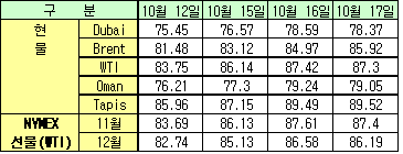 10월17일 0.22달러 하락 78.37달러 형성 … WTIㆍBrent도 약세 10월17일 국제유가는 미국 석유 재고가 예상보다 큰 폭으로 증가해 하락했다.한국석유공사에 따르면, 뉴욕상업거래소(NYMEX)의 WTI(서부텍사스 중질유) 선물유가는 전일대비 0.21달러 하락한 87.40달러에, 런던석유거래소(ICE)의 Brent 선물유가는 0.42달러 하락한 83.13달러에 거래를 마감했다. Dubai 현물가격은 0.22달러 하락해 78.37달러를 형성했다.