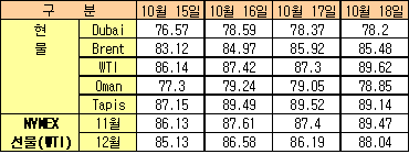 10월18일 WTI 2.07달러 상승 89.47달러 … Dubai유는 소폭 하락 10월18일 국제유가는 달러화 약세 지속, 중동의 지정학적 불안 우려 증가에 따른 석유 공급 차질 등으로 상승했다.한국석유공사에 따르면, 뉴욕상업거래소(NYMEX)의 WTI(서부텍사스 중질유) 선물유가는 전일대비 2.07달러 상승한 89.47달러에, 런던석유거래소(ICE)의 Brent 선물유가는 1.47달러 상승한 84.60달러에 거래를 마감했다. Dubai 현물가격은 전일 미국의 석유 재고 증가 영향으로 0.17달러 하락해 78.20달러를 형성했다.