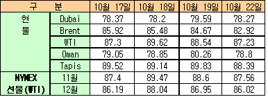 10월22일 1.32달러 하락 78.27달러 형성 … WTIㆍBrent도 하락 10월22일 국제유가는 미국경제 둔화 우려, 미국 달러화 약세 둔화, 터키 쿠르드의 외교적 협상의지 표명 등의 영향으로 하락했다.한국석유공사에 따르면, 뉴욕상업거래소(NYMEX)의 WTI(서부텍사스 중질유) 선물유가는 전일대비 1.04달러 하락한 87.56달러에, 런던석유거래소(ICE)의 Brent 선물유가는 0.52달러 하락한 83.27달러에 거래를 마감했다. Dubai 현물가격은 1.32달러 하락해 78.27달러를 형성했다.