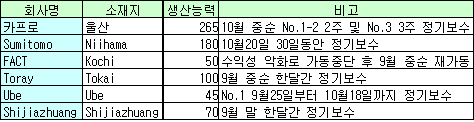 카프로 울산 소재 26만5000톤 정기보수 … 수출은 일시 중단 국내 CPL(Caprolactam) 시장은 10월 카프로가 3개 플랜트 모두 정기보수를 실시함에 따라 내수공급을 간신힌 맞추는 등 수급타이트가 심화돼 가격이 초강세를 나타내고 있다.10월10일 정기보수에 들어간 No.3 플랜트는 10월30일 재가동 예정이며 10월11일 가동중단한 No.2 플랜트는 10월25일 정기보수를 완료하며 10월12일 정기보수를 실시한 No.1 플랜트는 10월26일 가동을 재개할 전망이다. 3개 플랜트 생산능력은 No.1 대 No.2 대 No.3 플랜트가 1대2대2로 총 26만5000톤에 달하고 있다. 국내 유일의 카프로락탐 생산기업인 카프로는 내수시장에 공급하고 남는 물량을 수출에 소진하는 선내수후수출 전략을 펼치고 있는데, 10월 정기보수로 내수물량을 간신히 맞추고 있어 수급타이트가 심하며 수출은 일시 중단한 것으로 알려졌다. 국내 카프로락탐의 최대 수출국은 중국으로 내수가격보다 톤당 60달러-70달러 정도 높기 때문에 메리트가 있을 것으로 보이지만 Flake(고체) 상태로 수출해야 하기 때문에 용이하지 않으며 운송비 및 포장비 등을 고려하면 수출이 내수시장보다 굳이 메리트가 있는 것은 아니어서 내수에 주력하고 있다.
