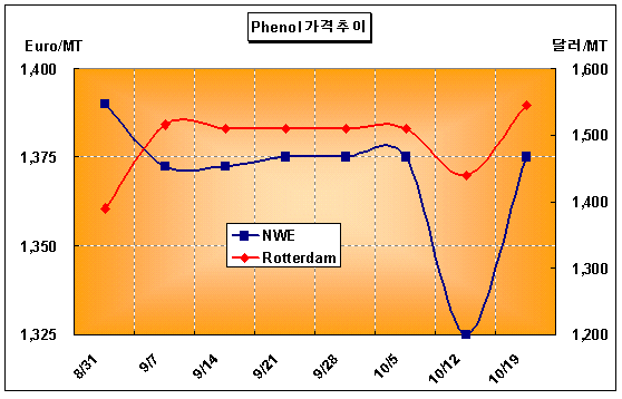 FOB Rotterdam 1540-1550 형성 … 2008년 Q2까지 타이트 지속 페놀(Phenol) 가격이 다운스트림의 수요회복으로 전주대비 100달러 폭등하면서 10월16일 FOB Rotterdam 톤당 1540-1550달러, FD NWE 톤당 1370-1380유로를 형성해 들쭉날쭉한 행보를 나타내고 있다.페놀 가격강세가 지속되고 있는 가운데 10월9일 다운스트림 수요부진으로 공급배분(Distribution)과 수출시황이 불안정해 FOB Rotterdam 톤당 1430-1450달러로 강세가 한풀 꺾여 폭락세를 나타냈는데 10월 셋째 주 들어 수요회복 기미가 보여 다시 폭등한 것으로 분석된다. Spot 시장도 바이어들이 계약을 통해 구매하려는 거래가 늘어남에 따라 잠잠한 행보를 나타지만 페놀 가격이 다시 강세를 나타내면서 FD NWE 톤당 1450유로에 Spot 거래가 이루어졌으며 물량부족도 심한 상황으로 알려졌다. 하지만, 수요처들이 페놀 강세로 구매를 꺼리고 있는 것으로 나타났다.