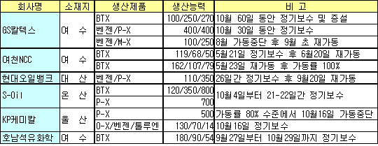 GS칼텍스는 여천 소재 벤젠(Benzene) 10만톤, 톨루엔(Toluene) 25만톤, 자일렌(Xylene) 27만톤의 정기보수를 10월 60일 동안, 벤젠 40만톤 및 P-X(Para-Xylene) 40만톤은 10월 30일간 실시하고 있다.