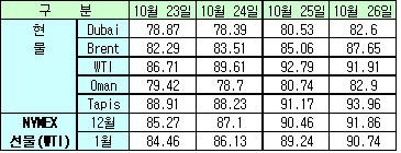 10월26일 20.7달러 상승 82.60달러 형성 … WTIㆍBrent도 급등 10월26일 국제유가는 미국의 동절기 수급불안 우려가 지속되는 가운데 중동지역의 정정불안 가능성 제기 및 공급 차지 우려로 상승했다.한국석유공사에 따르면, 뉴욕상업거래소(NYMEX)의 WTI(서부텍사스 중질유) 선물유가는 전일대비 1.40달러 상승한 91.86달러에, 런던석유거래소(ICE)의 Brent 선물유가는 1.21달러 상승한 88.69달러에 거래를 마감했다. Dubai 현물가격은 2.07달러 상승한 82.60달러를 형성했다.