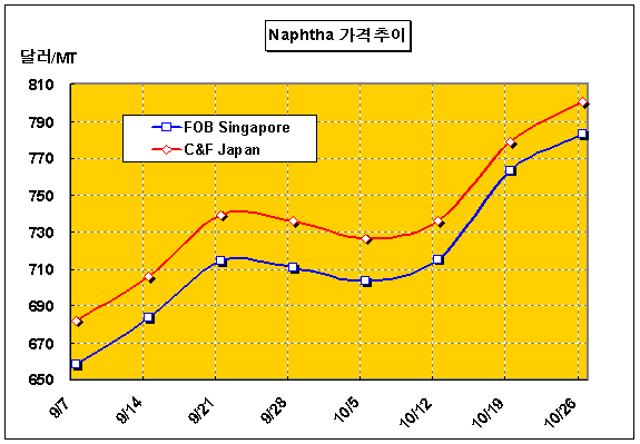 나프타 가격은 10월 넷째 주 C&F Japan 톤당 810달러로 22달러 상승했다.