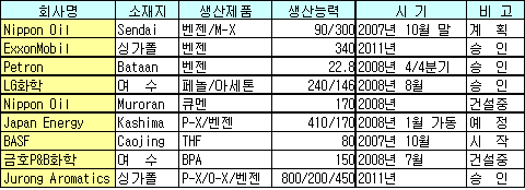 Japan Energy의 Kashima 소재 벤젠 17만톤 플랜트가 2008년 1월 가동을 시작하고, Nippon Oil은 벤젠 생산능력을 9만톤으로 확대하며, ExxonMobil은 34만톤으로 확대할 예정이다.