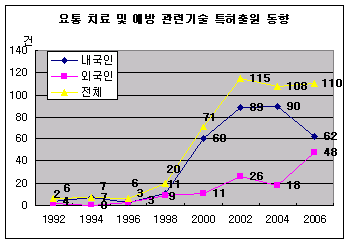 특허청, 특허출원 2000년 전후 급증 … 내국인 비수술 관련출원 많아 요통은 전체 국민의 70-80%가 일생에 한 번은 경험하게 되는 흔한 질환으로 요통의 치료와 예방관련 기술도 급증하고 있는 것으로 나타났다.사람의 척추는 척추골과 섬유 연골성 추간판(디스크)으로 이루어지는데, 척추는 강한 인대와 근육으로 강화돼 신체를 지지하며 평형을 유지하고 있다. 평형 상태가 바르지 못한 자세, 비만, 노화, 운동 부족 등 여러 가지 요인에 따라 균형을 잃게 되면 요통이 발생할 수 있는데, 디스크가 대표적인 것으로 알려져 있다. 특허청에 따르면, 요통의 치료 및 예방 관련기술에 대한 특허출원은 1992-2006년 443건으로 2000년을 전후로 급격한 증가를 보였는데, 내국인 출원은 폭발적인 증가세를 보이다가 2004년을 기점으로 주춤하는 양상을 나타내고 있다. 외국인 출원은 전체 건수에서는 내국인 출원보다 적지만 최근까지 지속적인 증가세를 나타냈다.