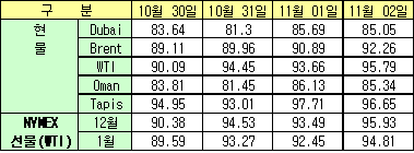 11월2일 0.64달러 하락 85.05달러 형성 … WTIㆍBrent는 폭등 Dubai 현물가격이 소폭 하락한데 반해, 국제유가는 미국 고용지표 개선에 따른 석유 수요증가 예상으로 상승했다.11월2일 Dubai 현물가격이 0.64달러 하락한 85.05달러를 기록했다. 한국석유공사에 따르면, 뉴욕상업거래소(NYMEX)의 WTI(서부텍사스 중질유) 선물유가는 전일대비 2.44달러 상승한 95.93달러에, 런던석유거래소(ICE)의 Brent 선물유가는 2.36달러 상승한 92.08달러에 거래를 마감했다.