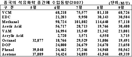 한편, 9월 옥탄올(Octanol) 수입은 2만톤 미만으로 급감했고, DOP(Dioctyl P{hthalate)는 2만3658톤으로 약간 줄어들었다. 표, 그래프: | 중국의 석유화학 중간체 수입동향(2007) | <화학저널 2007/11/05> |