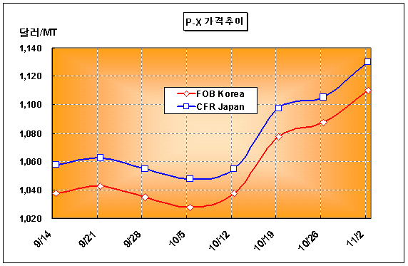 아시아 P-X(Para-Xylene) 가격이 유가 및 원료 M-X(Mixed-Xylene) 가격강세 장기화로 11월2일 1100달러 돌파하며 FOB Korea 톤당 1109-1110달러, CFR Taiwan/China 톤당 1129-1130달러를 형성했다.