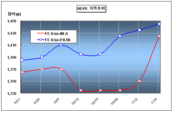CFR FE Asia 1420-1430달러 형성 … 국제유가 초강세에 사재기까지 HDPE 가격이 11월 둘째 주 CFR FE Asia 톤당 1420-1430달러로 75달러 폭등했다.아시아 HDPE(High-Density Polyethylene) 시장은 국제유가가 초강세를 보인 상태에서 구매수요가 몰려 3-4년 동안 최고수준인 75달러 폭등을 기록했다. 이에 따라 Injection 그레이드는 CFR FE Asia 톤당 1425달러를, Bow-Molding 그레이드는 1445달러를 나타냈다. 다만, Film 그레이드는 전주에 35달러 상승한 영향을 받아 10달러 오르는데 그쳐 CFR FE Asia 톤당 1435달러를 형성했다.