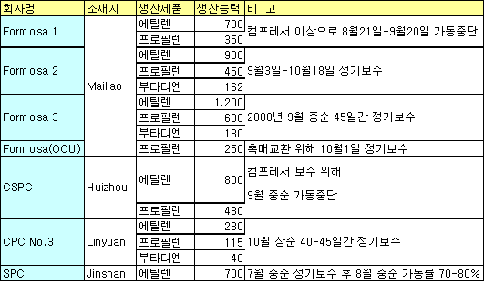 70만톤 및 90만톤 크래커 정기보수 완료 … CPC도 11월 정기보수 마무리 타이완의 CPC가 에틸렌(Ethylene) 23만톤 규모의 NCC(Naphtha Cracking Center) 정기보수를 실시 중인 것으로 알려졌다.CPC는 2007년 10월 초부터 40-45일 일정으로 No.3 크래커 정기보수에 돌입해 11월 가동을 재개할 예정으로 생산능력이 에틸렌 23만톤, 프로필렌(Propylene) 11만5000톤에 불과해 시장에 미치는 영향은 크지 않을 전망이다.