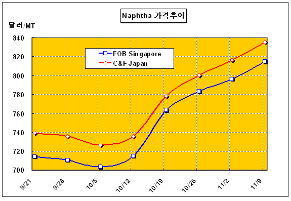 C&F Japan 834-837달러로 19달러 상승 … 유럽가격도 834달러 형성 나프타 가격은 11월 둘째 주 C&F Japan 톤당 836달러로 19달러 추가 상승했다.아시아 나프타(Naphtha) 시장은 국제유가가 WTI(서부텍사스 중질유) 배럴당 96달러를 상회하면서 초강세를 지속함에 따라 800달러대의 고공행진을 지속했다. 나프타 가격에 직접적인 영향을 미치는 북해산 Brent유 역시 배럴당 92달러를 상회하는 강세를 지속하고 있다. 그러나 나프타 가격이 지나치게 상승함으로써 에틸렌(Ethylene)을 비롯한 석유화학제품 코스트가 급상승해 수요 둔화가 우려되고 있다.