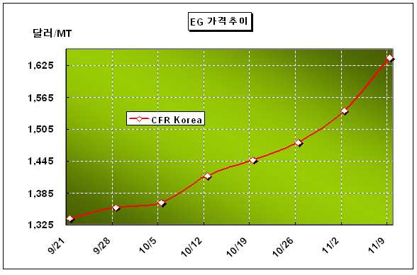 중국에서는 100톤의 소규모물량이 1만5000톤에 매물로 나왔으나 수요처들이 구매의사를 나타내지 않아 판매하지 못한 것으로 알려졌다. 표, 그래프: | MEG가격추이 | <화학저널 2007/11/13> |