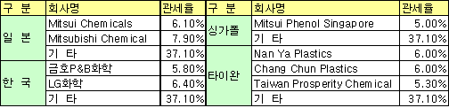 상무부, 덤핑방지관세율 5-8% 불과 … 금호 5.8%에 LG 6.4% 중국이 수입 BPA(Bisphenol-A)에 대한 덤핑방지관세 부과를 확정했다.중국 상무부는 2007년 8월29일 한국, 일본, 싱가폴 및 타이완에서 수입되는 BPA에 대해 최소 5.0%의 덤핑방지관세 부과를 확정하고 8월30일부터 5년 동안 적용된다고 발표했다.