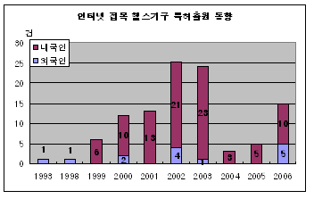 특히, 인터넷이 광범위하게 생활화된 1999년을 기점으로 출원이 급속히 증가하고 있는데, 내국인 출원이 91건(87%)으로 전반적으로 개인 발명가의 출원이 주도하고 있는 것으로 나타났다. 외국인 출원은 1993-2006년 14건이 출원돼 전체 출원건수 대비 13%를 차지하고 있는 것으로 나타났다.
