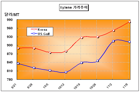 자일렌 가격은 11월 둘째 주 FOB Korea 톤당 983달러로 30달러 상승했다.