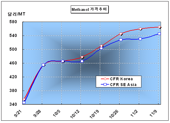 최근까지 불가항력을 선언하지는 않고 있으나 불가항력 선언이 불가피한 것으로 알려지고 있다. CNOOC Kingboard는 China National Offshore Oil과 Kingboard Chemical의 60대40 합작기업이다. 이에 따라 아시아 메탄올 가격은 톤당 600달러를 넘어설 가능성이 나타나고 있다. Methanex도 11월 아시아 계약가격을 CFR 620달러로 인상하겠다고 선언한 상태이다. 한편, 아시아 메탄올 가격은 11월9일 CFR Korea 톤당 565달러로 5달러 상승함으로써 9월14일 CFR Korea 톤당 285달러에 비해 100% 가까이 폭등했다. 표, 그래프: | Methanol가격추이 | <화학저널 2007/11/16> |