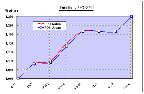 Nippon Oil이 전기공급 이상으로 에틸렌 크래커 가동을 중단해 부타디엔 7만톤 플랜트를 가동하지 못한 것도 영향을 미쳤다. 한편, 타이의 Bangkok Synthetic은 최근 가동률이 120-125%에 달하고 있는 Map Ta Phut 소재 SBR 6만톤 및 BR 4만톤의 정기보수를 위해 12월 가동을 중단할 예정이다. 표, 그래프: | Butadiene가격추이 | <화학저널 2007/11/20> |