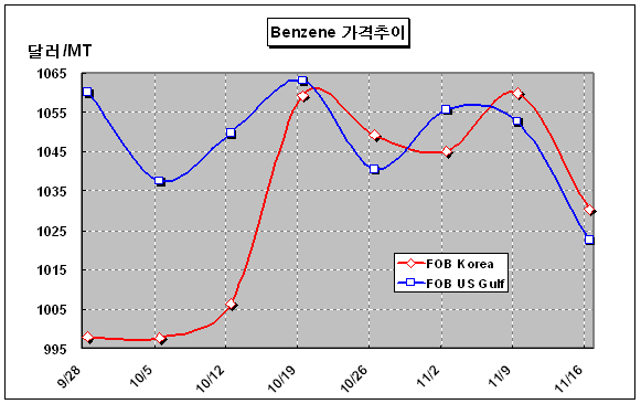 벤젠 가격은 11월 셋째 주 FOB Korea 톤당 1030달러로 30달러 하락했다.