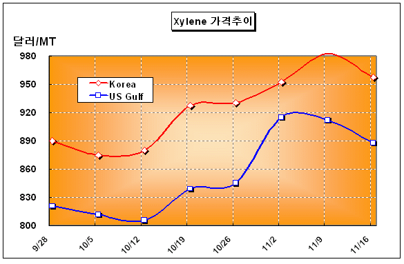 FOB Korea 957-958달러 형성 … 미국가격도 888달러로 하락세 지속 자일렌 가격은 11월 셋째 주 FOB Korea 톤당 958달러로 25달러 하락했다.아시아 자일렌(Xylene) 시장은 다운스트림의 부진으로 12월과 2008년 1월 수요가 부진할 것으로 예상되면서 5주 연속 상승세를 접고 25달러 하락했다. 미국의 자일렌 가격이 FOB US Gulf 갤런당 292센트로 톤당 평균 888달러를 형성하면서 24달러 하락한 것도 영향을 미쳤다. 미국과 아시아 사이의 운송비용이 톤당 60달러에 달해 무역 차익이 별로 없어졌기 때문이다.