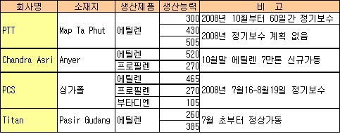 싱가폴 PCS는 7월 중순부터 8월 중순까지 한달간 에틸렌 46만5000톤 크래커의 정기보수를 계획하고 있는 것으로 알려졌다. <송주연 기자> 표, 그래프: | 아시아 올레핀 플랜트 가동현황 | <화학저널 2007/11/26> |