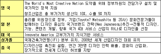 하지만, 대부분의 디자인 전문기업들이 영세하고 저부가가치 단순 개발에 머물러 있어 인력ㆍ규모ㆍ경험 면에서 대규모 프로젝트를 수행할 수 있는 역량과 경쟁력을 확보하기위해서는 디자인 기업들이 파트너십을 형성하고 공동으로 사업을 수행할 수 있는 디자인 클러스터 및 복합 콤플렉스 조성을 시급한 것으로 분석되고 있다. 전경련 관계자는 “매년 3만8000명 이상의 디자이너가 배출되고 있으나, 4년제 졸업생 취업률이 49.4%에 불과하다”며 “시각ㆍ섬유 등 정형화된 교육에서 벗어나 특성화 대학 및 자동차ㆍ가구 등 기업 맞춤형 교육을 통한 전문 디자인 인력양성이 필요하다”고 지적했다. 한편, 미국 MIT와 Carnegie Mellon 대학에서는 디자인과 공학을 함께 교육해 기업이 원하는 디자이너를 배출하고 있는 것으로 나타났다. <김 은 기자> 표, 그래프: | 주요국의 디자인 정책 추진 현황 | <화학저널 2007/11/28> |