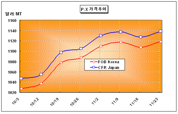 아시아 P-X(Para-Xylene) 가격이 11월23일 FOB Korea 톤당 1118-1119달러, CFR SE Asia 톤당 1135-1140달러, CFR Taiwan/China 톤당 1138-1139달러를 형성했다.