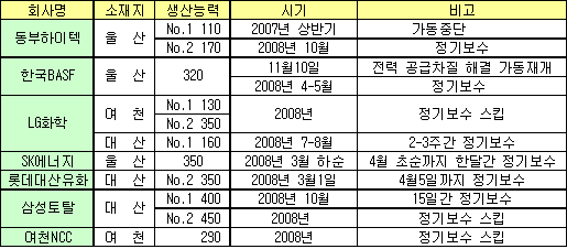 Idemitsu Kosan은 Chiba 소재 21만톤 플랜트의 정기보수를 2008년 4월 1주간 실시할 계획으로 알려졌다. Nippon SM은 Oita 소재 23만2000톤 플랜트의 정기보수를 2008년 3월22일부터 5월1일까지 장기간, Nippon Steel의 Oita 소재 19만톤은 2월19일부터 3월18일까지 한달간 계획하고 있다. <이선애 기자> 표, 그래프: | 국내 SM 플랜트 가동현황(2007) | <화학저널 2007/12/04> |