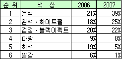 북미지역은 흰색 및 화이트펄이 시장의 19%, 트럭 및 SUV 부문에서는 26%를 차지하며 전체적으로 인기를 끌고 있는 반면, 은색은 중형차 및 CUV차량, 소형차 및 스포츠 차량 부문에서 활발히 채용되고 있다. 멕시코에서도 전체 시장비중의 32%를 차지하며 흰색 및 화이트펄이 우위에 있고 회색과 빨강이 각각 15%와 13%를 차지하며 2위와 3위를 차지하고 있다. 브라질에서는 은색이 전체 시장의 34%를 차지하며 인기를 주도하고 있는 것으로 나타났다. 중국에서는 은색과 검정이 비슷한 선호도를 보이며 1위와 2위에 나열됐으며 회색은 15%로 3위를 차지했다. 유럽에서는 검정이 시장의 약 25%를 차지하며 은색을 추월해 절대적인 인기를 끌고 있는데, 전년대비 인기도는 1% 상승했다. 특히, 검정은 MPV 부문에서의 3위를 제외하고 모든 차량계열에서 부동의 1위를 차지하고 있으며 미국과 유사하게 메탈 효과 블랙도 유행하고 있고 회색계열 및 파랑, 빨강과 같은 보다 선명한 색상의 선호도도 높은 것으로 나타났다. 일본은 2006년과 변함없이 흰색 및 화이트펄이 24%로 시장의 우위를 차지하고 있다. 은색은 전년대비 5% 하락한 22%로 1위와 근소한 차이로 2위를 차지했다. 북미와 마찬가지로 은색이 중형차와 소형 및 스포츠 계열의 차량에서 우위를 나타내고 있으며 흰색과 화이트펄, 파랑, 빨강이 상위 5위에 포함돼 있다. 이에 따라 DuPont은 2007년 흰색 및 화이트펄을 트랜드 색상으로 분석하고, 메탈과 다른 색상 효과를 보이는 새로운 블랙의 인기가 꾸준히 상승할 것으로 전망했다. 팬톤 칼라협회 수석임원인 Leatrice Eiseman는 “가구, 패션, 소비재, 산업디자인 등에서처럼 순수성과 미니멀리즘의 색상이자 변화 직전의 청정제로써 흰색이 각광을 받고 있다”며 “흰색 자동차에 대한 소비자들의 선호도 패션 트랜드를 따라가고 있는 것을 입증하고 있으며, 화이트펄은 변화 가능성에 대한 의식을 나타내고 있는 것”이라고 설명했다. <김 은 기자> 표, 그래프: | 한국의 자동차 색상 선호도 순위 | <화학저널 2007/12/07> |