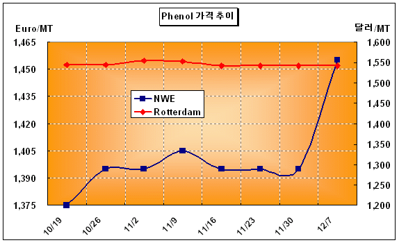 페놀(Phenol) 가격이 벤젠(Benzene) 가격하락에도 불구하고 12월4일 FOB Rotterdam 톤당 1540-1550달러, FD NWE 톤당 1450-1460유로를 형성해 초강세를 지속하고 있다.