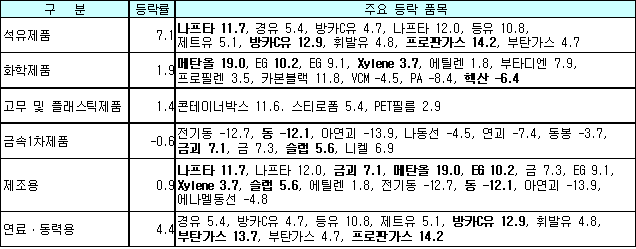 한국은행, 11월 가공물가 전반적 상승 … PAㆍVCM은 하락 2007년 11월 화학제품 가공물가는 메탄올(Methanol)이 19.0% 급등한 반면, 무수프탈산은 8.4% 하락한 것으로 나타났다.한국은행이 발표한 <2007년 11월 가공단계별 물가동향>에 따르면, 원재료가 국제 원유 및 곡물가격 상승으로 큰 폭의 오름세를 보이며 전월대비 7.5% 상승했고, 중간재도 유가상승 및 주요국의 공급차질로 석유제품, 화학제품을 중심으로 오름세를 보이며 1.4% 상승했다. 자본재(0.4%)는 원화 약세로 수입기계류를 중심으로 오르고, 소비재(0.4%)도 석유제품을 중심으로 오름세를 보였다. 원재료는 비철금속 국제시세 하락으로 공산품이 2.0% 내렸으나, 중국의 수요증가 및 운임상승 영향으로 수입농산품이 큰 폭으로 오른 데다 국제유가 상승으로 원유 등 수입 광산품(9.4%)도 큰 폭으로 올라 전월대비 7.5%, 전년동월대비 31.0% 상승했다. 제조용이 동광석, 아연광석 등이 급락하였으나 원유, 액화천연가스, 옥수수 등이 올라 전월대비 7.9%, 연료용은 액화천연가스, 우라늄 등이 올라 3.1% 상승한 것으로 나타났다. 중간재는 비철금속 국제시세 하락으로 금속1차제품이 하락했으나, 국제유가 상승, 중동ㆍ남미 지역 설비 가동률 저하 등으로 석유ㆍ화학제품, 고무ㆍ플래스틱제품이 올라 전월대비 1.4%, 전년동월대비 7.2% 상승했다. 제조용은 전기동, 아연괴, 에나멜 동선 등이 큰 폭의 하락세를 보였으나 나프타(Naphtha), 메탄올(Methanol) 등 대다수 석유화학제품이 올라 0.9% 상승했다.