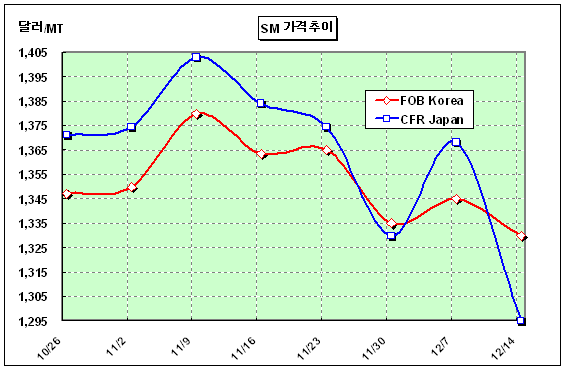 FOB Korea 1330-1331달러로 15달러 떨어져 … 중국가격 73달러 폭락 SM 가격은 12월 둘째 주 FOB Korea 톤당 1330달러로 15달러 하락했다.아시아 SM(Styrene Monomer) 시장은 중국가격이 크게 하락하면서 아시아 가격 하락세를 유도하고 있으며, 머지않아 1300달러도 붕괴될 것으로 예상된다. CFR China는 1295달러로 무려 73달러 폭락했으며, FOB Korea와의 스프레드가 35달러에 달하고 있다. 중국 동부지역의 SM 내수가격은 950위안 폭락해 ex-tank Zhangjiagang/Jiangyin 톤당 1만375위안으로 톤당 1164달러를 형성했으며, 남부지역은 1만500위안으로 마감했다.