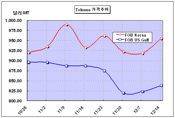 FOB Korea 955-956달러로 37달러 상승 … 미국가격은 857달러 불과 톨루엔 가격은 12월 둘째 주 FOB Korea 톤당 956달러로 37달러 상승했다.아시아 톨루엔(Toluene) 시장은 SK에너지의 모험적인 Spot 구매가격 인상으로 크게 올랐으며, 10월 말부터 12월 중순까지 오락가락 행보를 지속하고 있다. SK에너지는 중국 거래처 CRC(China Resources Chemical)로부터 2008년 1월 하순 거래물량을 FOB Korea 톤당 958달러에 구매한 것으로 알려졌다. 그러나 유럽의 2008년 1월 Spot 가격이 FOB Rotterdam 톤당 830달러, 미국가격은 FOB US Gulf 갤런당 282센트로 톤당 857달러에 불과해 하락세 전환이 불가피해지고 있다. 아시아-미국의 선박운송료 톤당 70-80달러를 고려하면 적자가 불가피하기 때문이다.