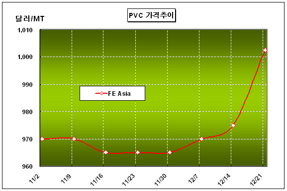 PVC 가격은 12월 셋째 주 CFR FE Asia 톤당 1003달러로 28달러 상승했다.