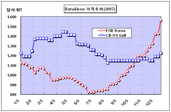 800달러에서 1600달러로 껑충 … 2006년보다 300달러 이상 하락 2007년 부타디엔(Butadiene) 가격은 상반기 수요부진으로 가격이 급락해 고전을 면치 못했다.그러나 하반기부터 수급타이트가 심화돼 7월 FOB Korea 톤당 800달러 수준에서 12월에는 1600달러에 근접하며 100% 상승하는 기록을 세웠다. 하지만, 부타디엔 최고기록을 세웠던 2006년에 비해 연평균 가격은 300달러 이상 하락한 것으로 나타나 효자품목으로 자리매김하는데 실패했다. 2007년 부타디엔 수요기업들은 정기보수 이전부터 미리 재고를 충분히 확보해 2006년과 같은 가격폭등의 싹을 잘라 상반기에는 부타디엔 가격폭락을 초래했다. 또한 삼성토탈과 LG화학이 정기보수기간 동안 디보틀넥킹(Debottlenecking)을 통해 부타디엔 생산능력을 확대해 정기보수 이후 공급량이 증가했으며, 타이완 Formosa도 6월 에틸렌(Ethylene) 크래커 증설로 부타디엔 생산능력을 18만톤 확대해 부타디엔 가격하락 원인으로 작용했다. 이에 따라 부타디엔 가격은 1월 1100달러 수준을 기록했으나 약간의 반등에도 불구하고 7월 초 800달러 수준까지 하락세를 지속했다.