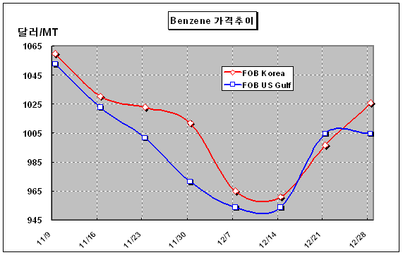 FOB Korea 1026달러로 29달러 상승 … 동남아 1만7000톤 유입이 변수 벤젠 가격은 12월 마지막 주 FOB Korea 톤당 1026달러로 상승했다.아시아 벤젠(Benzene) 시장은 미국가격이 크게 상승한 상태에서 SK에너지가 미국 공급용 구매에 적극 나서면서 4주만에 1000달러를 넘어섰다. 미국의 벤젠가격은 2월 거래물량이 FOB US Gulf 갤런당 14센트(톤당 41.90달러) 올라 갤런당 3567센트(톤당 1065.5달러)를 형성했다. 국제유가가 다시 강세로 돌아서고 아시아에서 미국 수출이 거의 중단돼 수급이 타이트하기 때문이다.