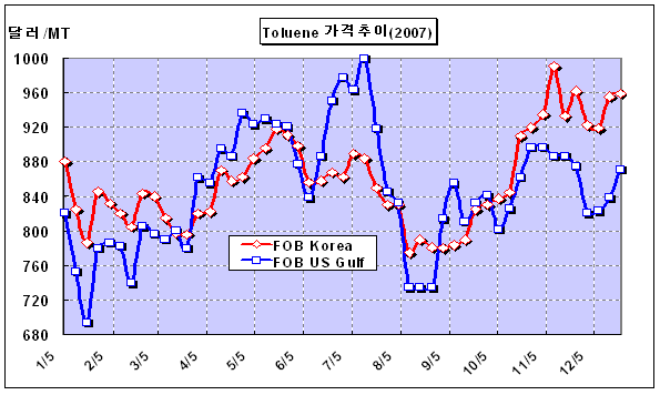 특히, 미국의 가솔린 시즌이 도래하면 미국가격이 상승하면서 아시아 가격도 연동해 움직이는 것이 일반적이나 2007년 가솔린 시즌에는 톨루엔 가격상승 폭이 크지 않았고 하반기에도 전례 없는 유가폭등으로 예외적인 상황의 연속이었다.