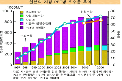 2006년 4.6%p 상승 66.4%로 최고실적 … 판매는 2.6% 증가 54만4000톤 일본의 2006년 PET(Polyethylene Terephthalate)병 회수율이 전년대비 4.6p 증가한 66.4%를 기록해 사상 최고 실적을 갱신함과 동시에 유럽ㆍ미국을 크게 웃돌며 세계최고 수준을 유지했다.일본 PET병 리사이클 추진협의회가 발표한 <2007년 연차 보고서>는 2006년 실적에서 산출식 분모를 <PET병용 수지생산량>에서 <PET병 판매량>으로 변경하고 미네랄 워터 중량을 더함과 동시에 성형시 로스를 배제해 보다 실제에 가깝도록 했다. 회수율은 (시ㆍ군ㆍ구별 분별 수집량+사업계 병회수량)÷(지정 PET병 국내제품 판매량+수입제품 판매량)으로 계산했다. 협의회는 회수율 75%를 목표로 대응해갈 방침이다. 2006년 판매량은 2.6% 증가한 54만4000톤으로 수입제품은 2만1000톤을 기록했다. 시ㆍ군ㆍ구별 수집과 사업계 PET병 회수량을 합한 전체 회수량은 10.3% 증가한 36만1000톤으로 회수율이 66.4% 향상돼 미국 23.5%, 유럽 36.8%를 웃돌았다. 또 2006년 낙찰량은 14만4000톤으로 지정법인에 의한 유상입찰이 최초로 실시되면서 평균 낙찰가격은 kg당 17.3엔으로 재상품화 사업자가 지정법인에게 지불한 21억4000만엔이 시ㆍ군ㆍ구에서 집행됐다. 2006년 12월 지정법인으로의 원활한 인도를 위한 기본방침이 책정됐지만 국외 유출이 지속되면서 2007년 계약량은 14만1000톤으로 낮은 수준을 기록했다.