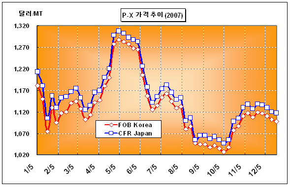 4-5월 강세 제외하고는 약세 지속 … 2008년 1000달러 붕괴 가능성 P-X(Para-Xylene) 가격은 2007년 전반적으로 약세를 나타냈다.아시아 P-X 시장은 중국의 Polyester 생산 확대에 따라 2005-06년 비정상적으로 호조를 보였으나 2007년 들어서는 공급과잉 징후가 뚜렷해 수익성 악화가 우려되고 있다. 2007년에는 FOB Korea 톤당 1200달러 수준에서 불발해 한때 1300달러에 육박했으나 곧바로 하락해 9-10월에는 1000달러 수준으로 떨어졌고 1100달러 수준에서 마감했다. 중국의 Polyester 가동률이 높지 않음은 물론 다운스트림인 PTA(Purified Terephthalic Acid) 가격이 800달러 후반의 약세를 지속했기 때문이다.